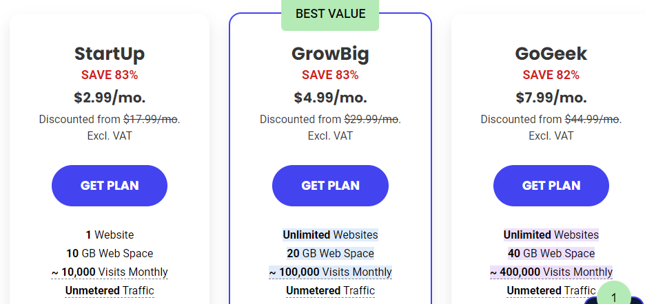 Let’s take the BEST VALUE plan as an example at $4.99/month. Yes, the plan says it is discounted from $29.99/month, but it is important to know that when the plan renews, you will no longer have that 83% savings. Considering that websites tend to exist for years, it is best not to be fooled by the discounted rate, instead look directly at the real value that comes to just under $360 per year.